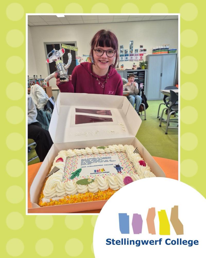 Heel veel basisschoolleerlingen hebben op vrijdagochtenden aan onze kennismakingsochtend meegedaan. Na afloop kregen ze een A3-vel met drie robothoofden mee naar huis, om zichzelf thuis of in de klas als robot uit te gaan beelden. Deze robothoofden mochten ze tijdens onze Open Dag op woensdag 28 januari inleveren. Isabella van basisschool De Toekan in Oosterwolde had zó’n mooie robot geknutseld dat zij een taart voor de hele klas (groep 8b) won!